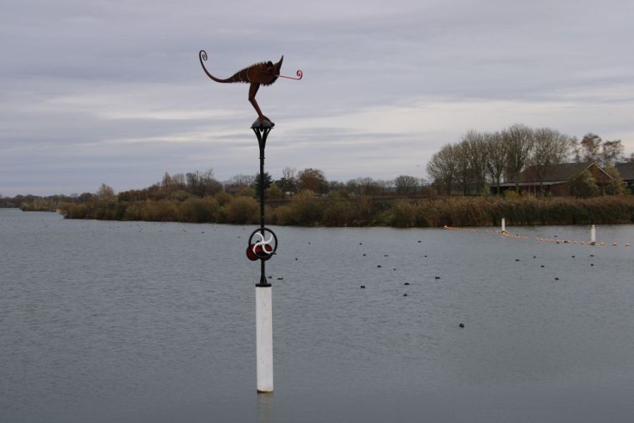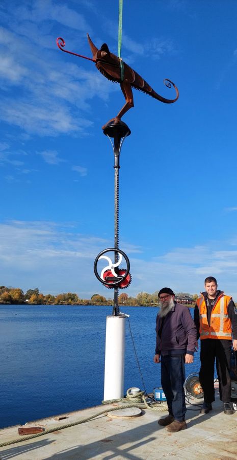 Een twaalf meter lange paal, bedoeld als fundament voor het kunstwerk, is tot tien meter onder het wateroppervlak in de bodem van de Kraaijenbergse Plassen geheid. Met een werkponton vol gereedschap kon Juul, na een half uur varen vanaf Linde, de locatie bereiken. “Op het water hebben we alles opgebouwd. Ik gebruikte vijfentwintig kilo lood om het kunstwerk te balanceren, zodat het met de wind kan meedraaien. Afhankelijk van waar je staat verandert het zicht op het beeld, precies zoals in de natuur.” ‘De Kameleon’, die tot stand kwam in samenwerking met verschillende regionale partners, werd vanaf de wal onder grote belangstelling feestelijk onthuld. KwarTAALdichter Charlotte Selten schreef er een passend gedicht bij, dat een op zichzelf staand kunstwerk is en aan de waterkant te lezen valt. “De mensen vinden het mooi, en dat vind ik belangrijk,” besluit Juul.