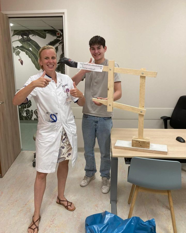 Naast wetenschap draait haar vak ook om nabijheid en vertrouwen. Dat bleek toen een van haar patiënten, de 17-jarige Tijmen, na een lange opname een bijzonder cadeau maakte: een houten machine waarmee ze zichzelf schouderklopjes kan geven. “Geef jezelf een schouderklopje, je hebt het verdiend!”, staat erop. Het hartverwarmende gebaar ging viral in het noorden en illustreerde de dankbaarheid die patiënten voelen voor haar persoonlijke betrokkenheid.