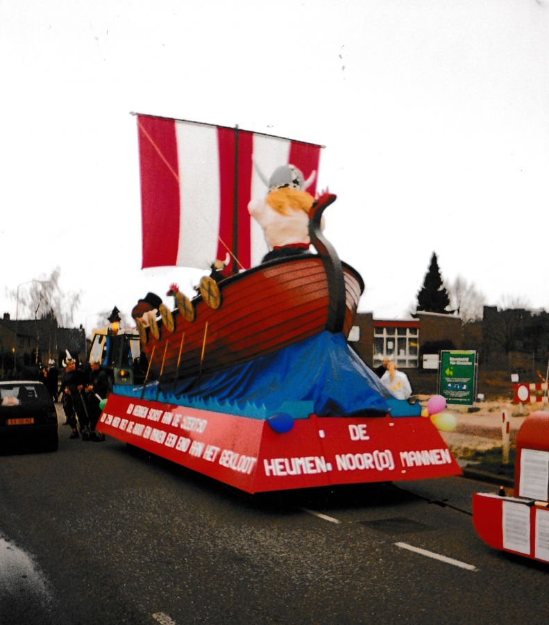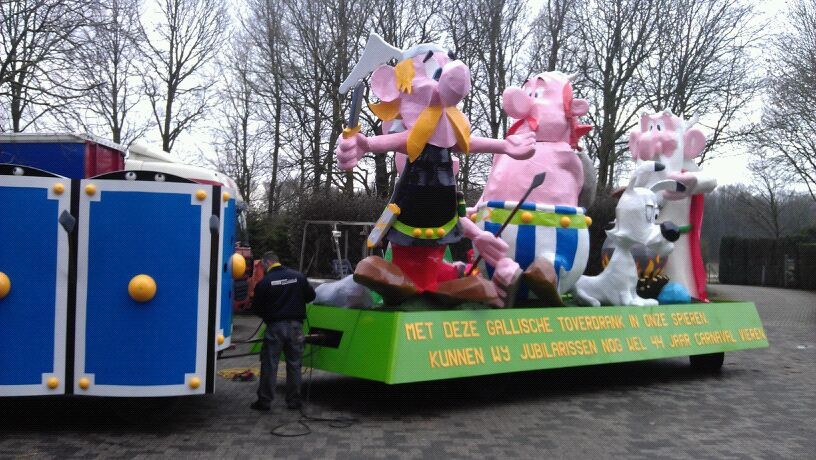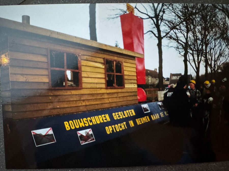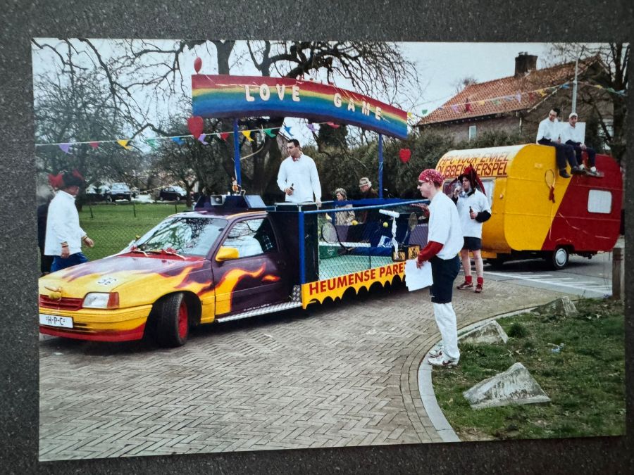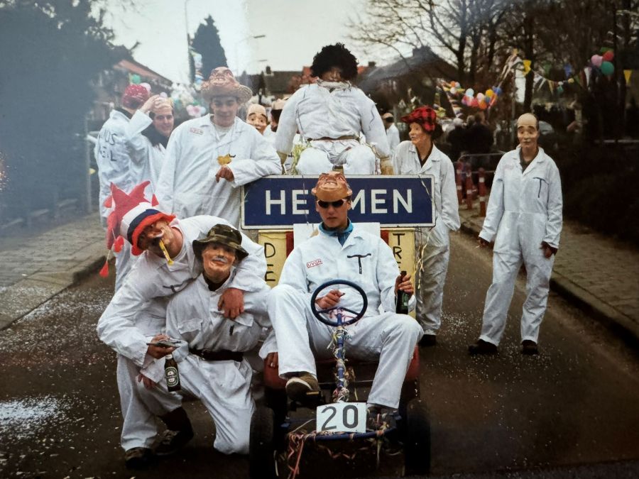 Het is inmiddels 33 jaar geleden dat vier jonge Heumense vrienden, Ronald, Mark, Mathieu en Tommy, het lumineuze idee kregen om ook eens mee te doen met de optocht. “We waren een jaar of vijftien, zestien,” herinnert Mark zich. “We zagen die stoet voorbijtrekken en dachten: dat kunnen wij ook.” Hun allereerste creatie was een gevangeniswagen, compleet met tralies, overalls en boevenpetten. “Het was meer enthousiasme dan techniek,” lacht Tommy. “Maar we deden mee en dat was het begin van iets moois.”