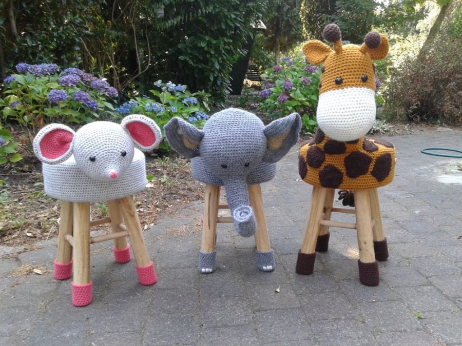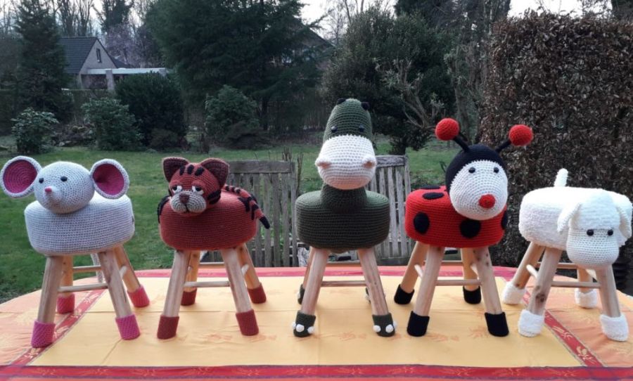 De houten krukjes, ongeveer 42 centimeter hoog, zijn geschikt voor kinderen tot zo’n tien jaar, maar worden ook vaak als decoratie gebruikt in woon- of slaapkamers. “Ik haak voor elk krukje een afneembare hoes met daarop een dierenkop. Van dino tot lieveheersbeestje, van giraf tot schaap, uit 13 verschillende dieren kunnen mensen hun favoriete dier uitzoeken,” vertelt Ria trots.