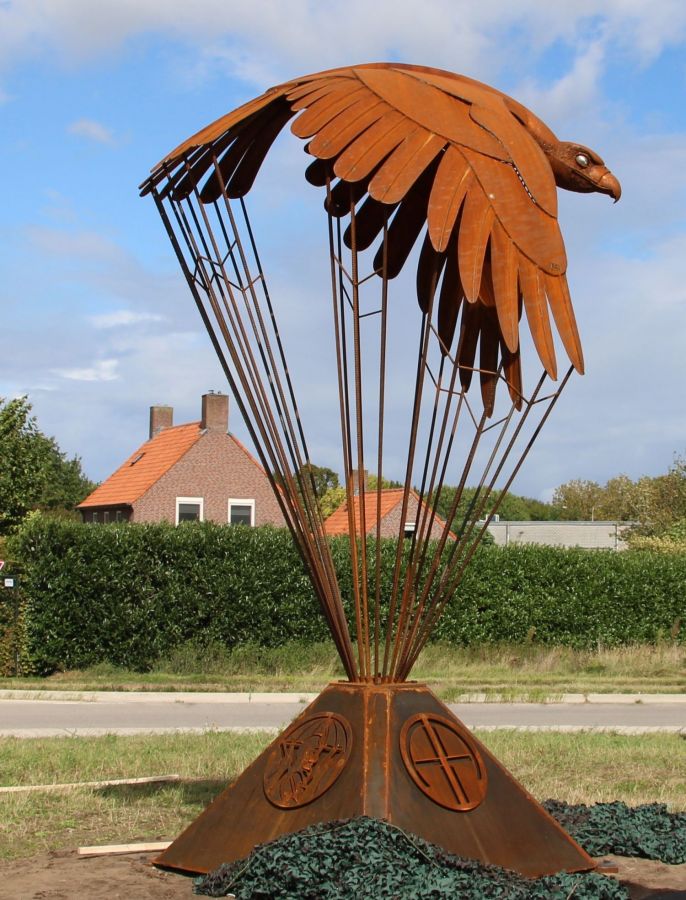 Met een summiere schets presenteerde Joshua zijn ontwerp voor het monument op de rotonde aan de opdrachtgever. Over elk detail werd zorgvuldig nagedacht. De sokkel bestaat uit vier zijden, elk met een eigen betekenis. Op één zijde prijkt het Airborne-logo, op een andere het cijfer 82, verwijzend naar de US 82nd Airborne Division waartoe luitenant Hanford A. Files behoorde. Ook het getal 504 heeft een prominente plaats: dit is het regimentsnummer van het 504th Parachute Infantry Regiment, een onderdeel van de divisie. De vierde zijde toont een duivel, symbool van dit regiment, dat tijdens de Tweede Wereldoorlog de bijnaam “Devils in Baggy Pants” kreeg. Deze eretitel werd later het herkenningsteken van het regiment. De ijzeren spijlen in het kunstwerk verbeelden de lijnen van een parachute, terwijl de imposante Amerikaanse zeearend, het nationale symbool van de Verenigde Staten, fungeert als parachutedoek.