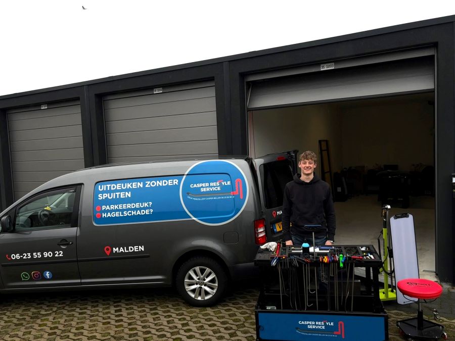 Op slechts 21-jarige leeftijd is Casper al eigenaar van zijn eigen onderneming: Casper Restyle Service in Malden. Met een flinke dosis vakmanschap en passie voor werken met zijn handen timmert hij sinds mei 2025 hard aan de weg in de wereld van het uitdeuken zonder spuiten. “Ik heb altijd iets met mijn handen willen doen,” vertelt Casper. “Dat zat er al vroeg in.”