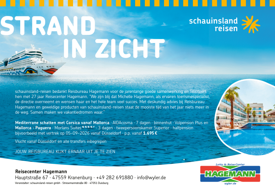 Aan de grensovergang bij Wyler, pal tussen Duitsland en Nederland, staat een familiebedrijf dat al 105 jaar onlosmakelijk verbonden is met de regio. Wat ooit begon als een smederij, groeide uit tot een vertrouwd Lotto-kantoor en inmiddels al 27 jaar tot een succesvol reisbureau: Reise-Center Hagemann. Sinds 1 januari van dit jaar staat de vierde generatie aan het roer. Michelle Hagemann heeft het stokje overgenomen van haar vader Johannes.