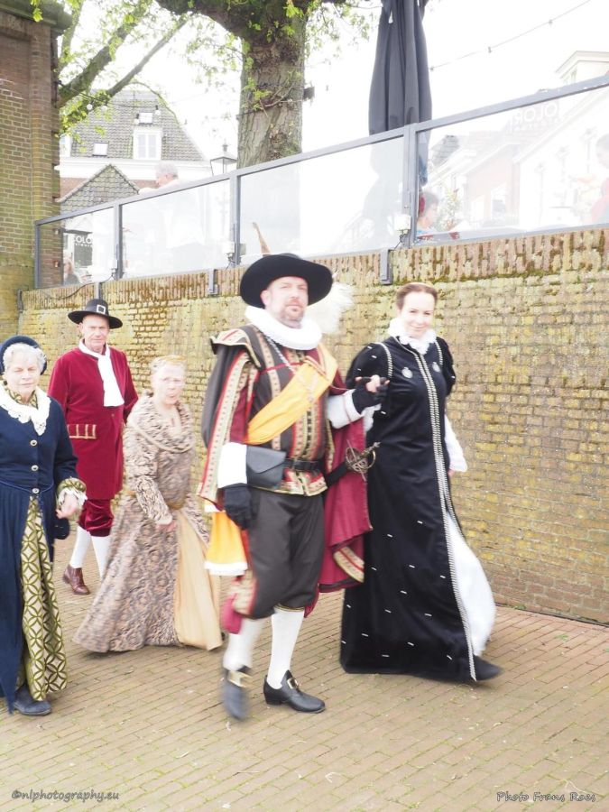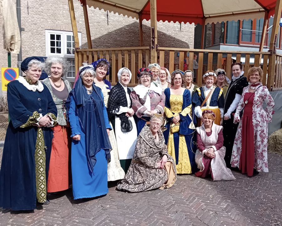 In 2018 stonden Ans en Hannie voor een grote uitdaging. Tijdens het Historisch Spektakel van dat jaar kwamen Willem van Oranje en Anna van Buren opnieuw tot leven. Aan de vriendinnen de taak om hun kostuums te maken, te beginnen met de jurk van Anna. “Aan de hand van historische afbeeldingen hebben we elk detail van hun kleding na proberen te maken. Dat is bijzonder goed gelukt. In 2019 werd het kostuum van Willem gemaakt, wat in 2022 te zien was. Het idee van een bruidsjurk ontstond toen, daar zijn we een hele tijd mee bezig geweest. Een leuk detail is dat in de jurk stof is verwerkt uit de bruidsjurk van de moeder van degene die de rol van Anna speelt. Toen het bruidspaar in 2024 tijdens het Historisch Spektakel door Grave liep en bezoekers met hen op de foto wilden, hebben we daar echt van genoten”.